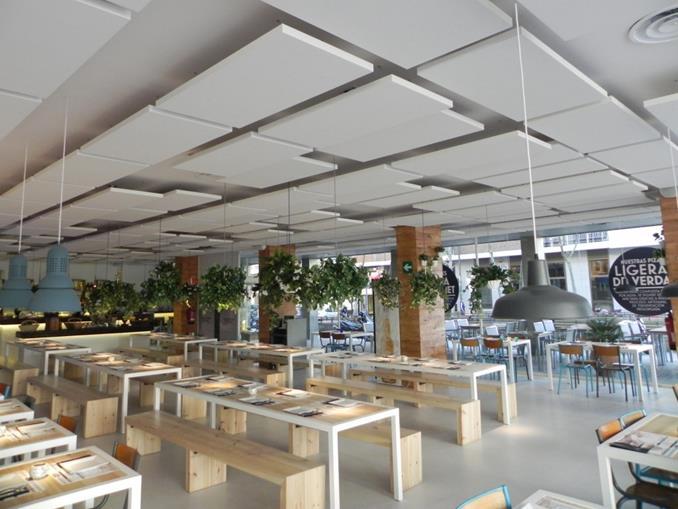Como caso práctico, vamos a estudiar el ejemplo del restaurante Kms de Pizza: tal y como vemos con la herramienta de cálculo del CTE (Código Técnico de la Edificación), el local tenía un tiempo de reverberación de casi 3 segundos. Este tiempo está por encima de lo permitido por el CTE para este tipo de locales, pero lo más importante es que los dueños del restaurante se dieron cuenta de la pérdida de clientes que les podía generar este nivel de ruido. Mediante la instalación de 156 islas acústicas de ECOPHON SOLO suspendidas, se consigue reducir el tiempo de reverberación a 0,5 segundos, con lo que se cumple con el CTE y los clientes pueden disfrutar de un ambiente agradable y disfrutar de la sobremesa. Además, gracias a su rapidez y sencillez de instalación, no hubo que cerrar el restaurante en ningún momento. Os adjuntamos un par de fotos para que veáis lo bien que ha quedado decorado el local.