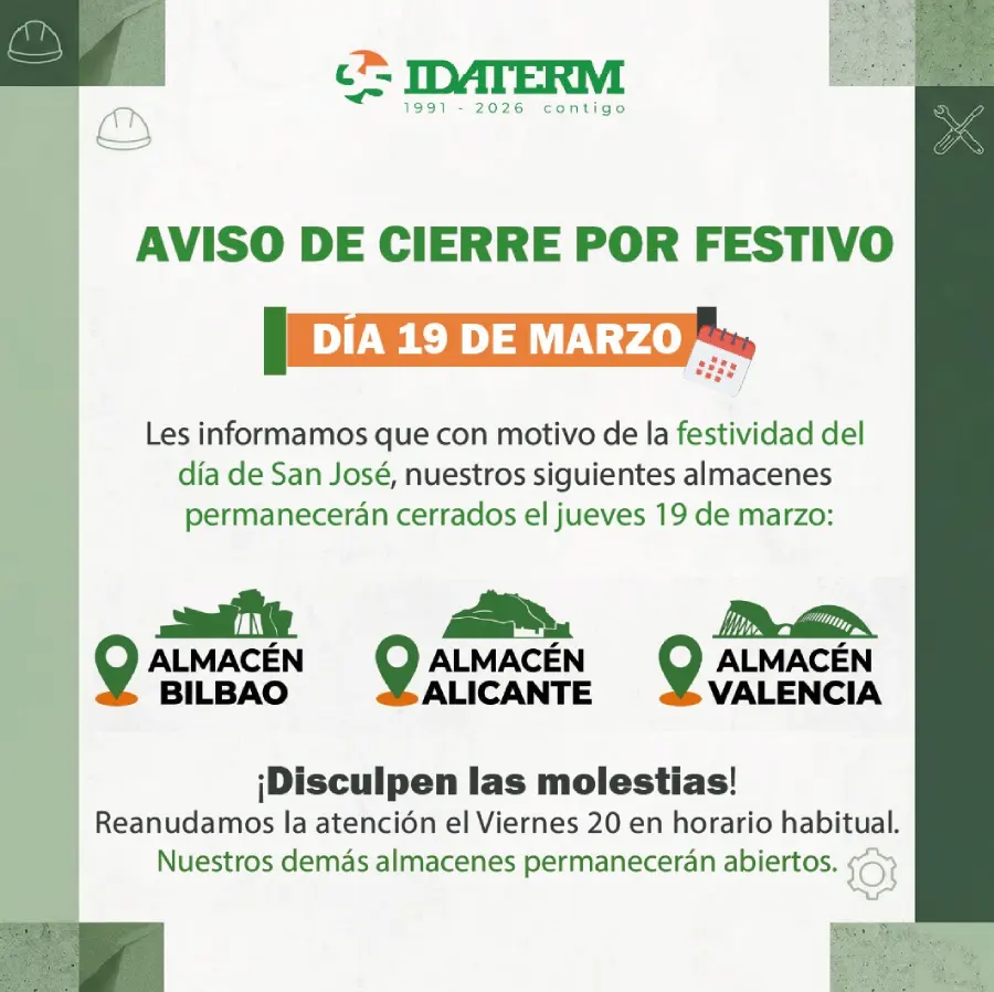 Les informamos que, con motivo de la festividad del Día de San José, mañana jueves 19 de marzo, nuestros centros logísticos en las siguientes ubicaciones permanecerán cerrados: