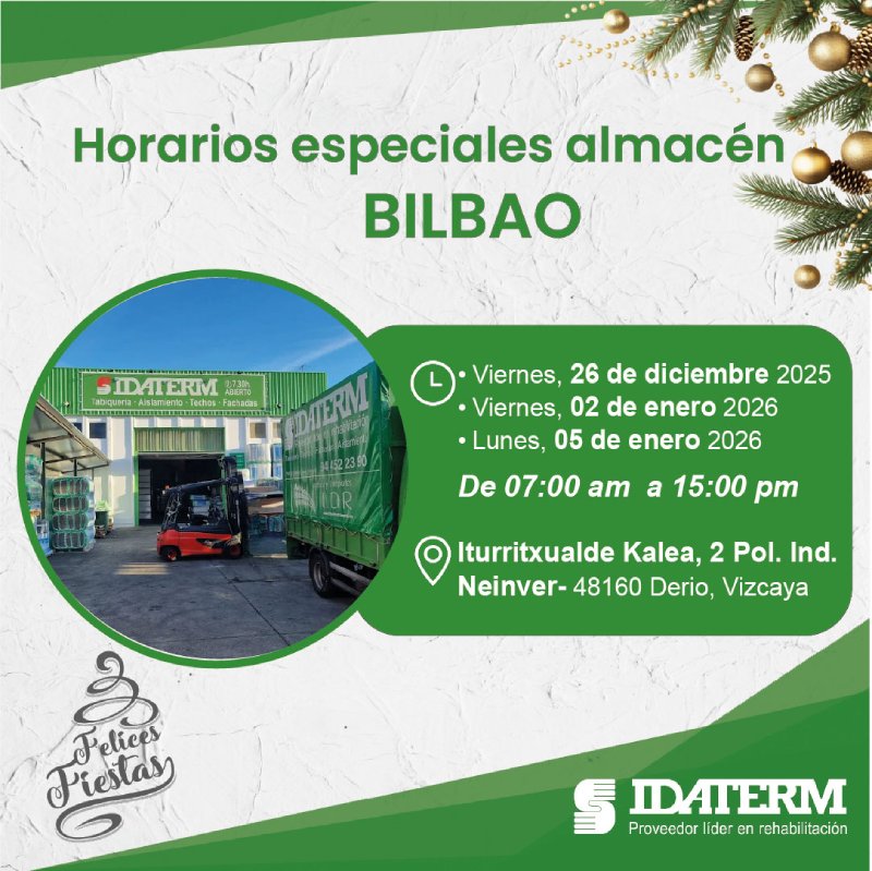 Llegan las fechas navideñas y en Idaterm queremos asegurarnos de que tus proyectos de aislamiento y construcción eficiente sigan avanzando al mejor ritmo. Para que puedas organizar tus pedidos y recogidas de materiales con antelación, te informamos de los ajustes que realizaremos en nuestros horarios de atención.