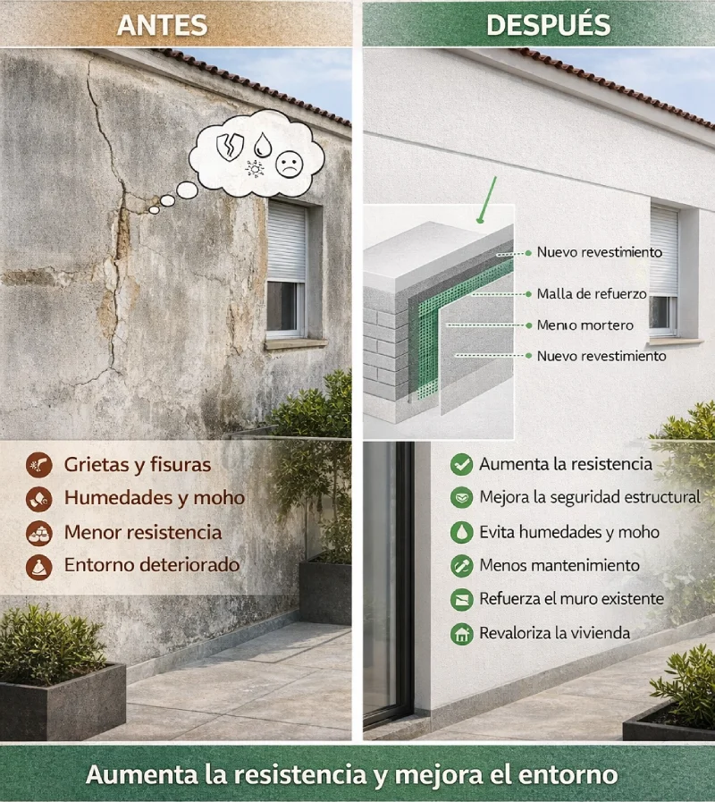 Por ello, sin una intervención adecuada, estos factores pueden provocar fisuras, desprendimientos, filtraciones de agua y pérdida de estabilidad, comprometiendo tanto el espacio exterior como el interior de la vivienda.
