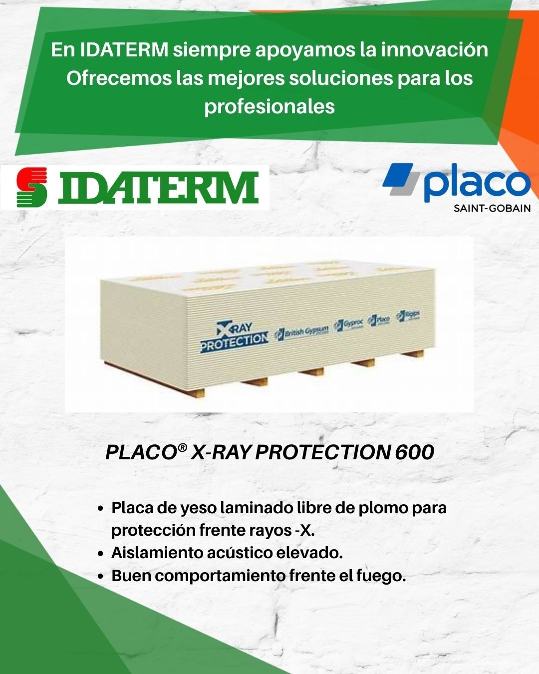 En Idaterm, nuestro compromiso con los profesionales de la construcción va más allá de ofrecer materiales de calidad. Nos esforzamos por estar siempre a la vanguardia, presentando las últimas innovaciones y lanzamientos en soluciones constructivas que marcan la diferencia en sus proyectos. Un claro ejemplo de esta filosofía es la incorporación a nuestro catálogo de la revolucionaria placa Placo X-Ray Protection.